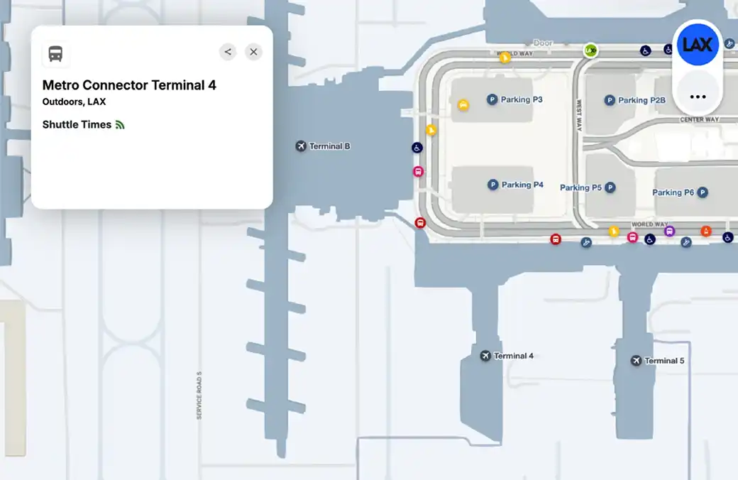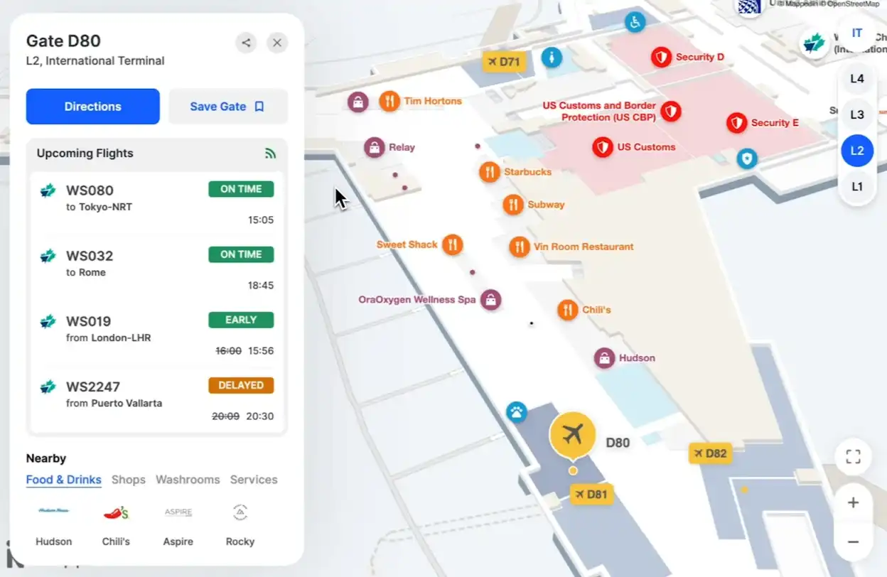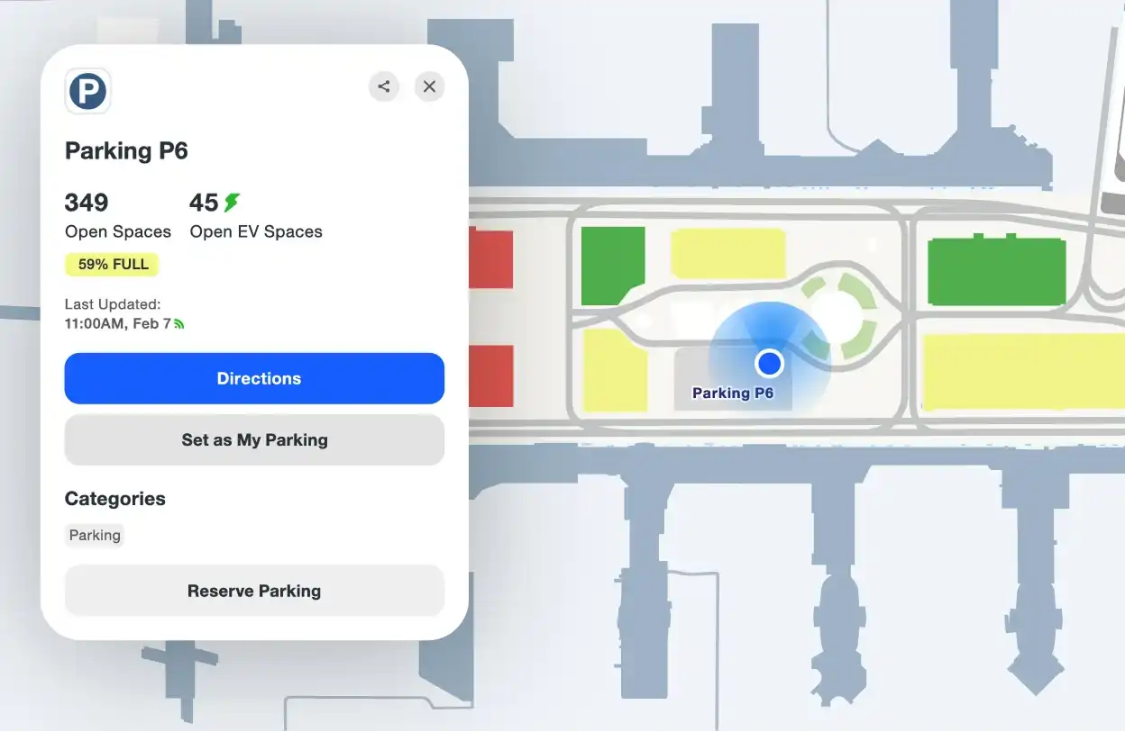 Flight info, security waits, parking, and shuttle times all update in real time, giving passengers current information wherever they look.